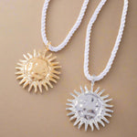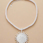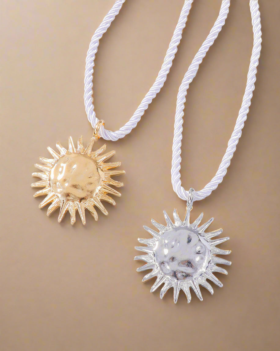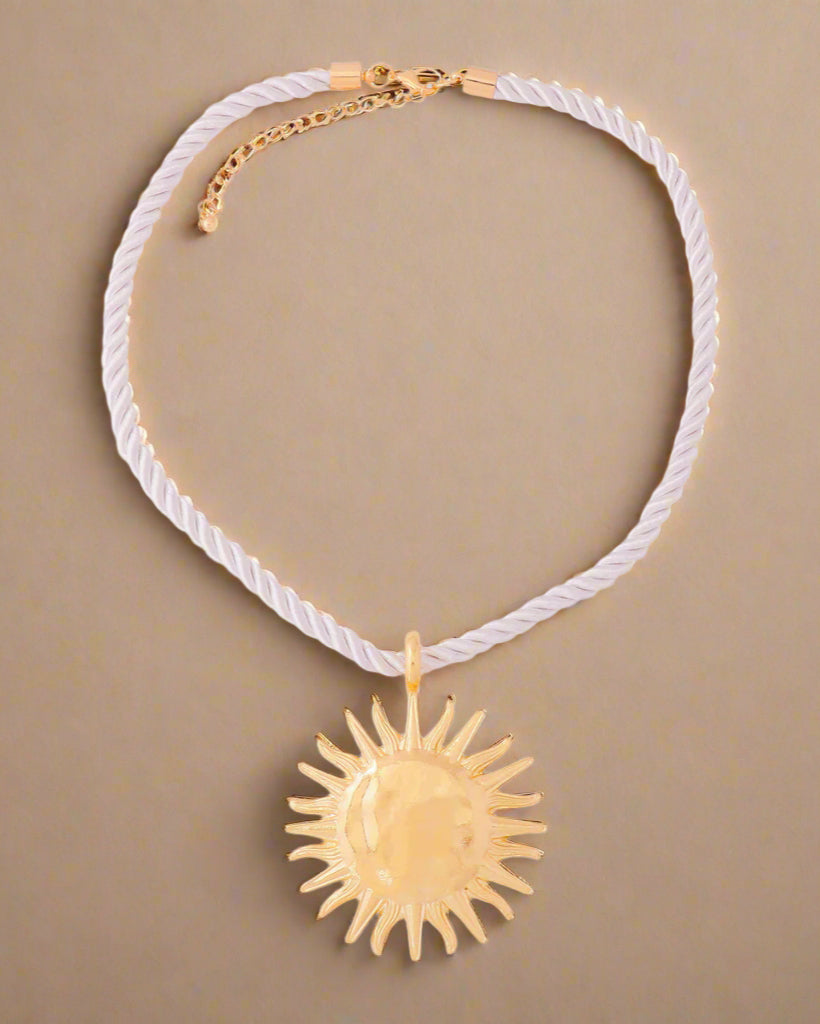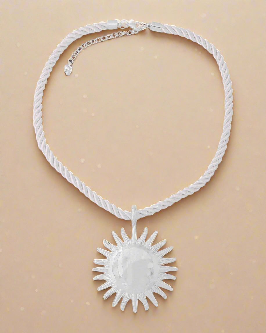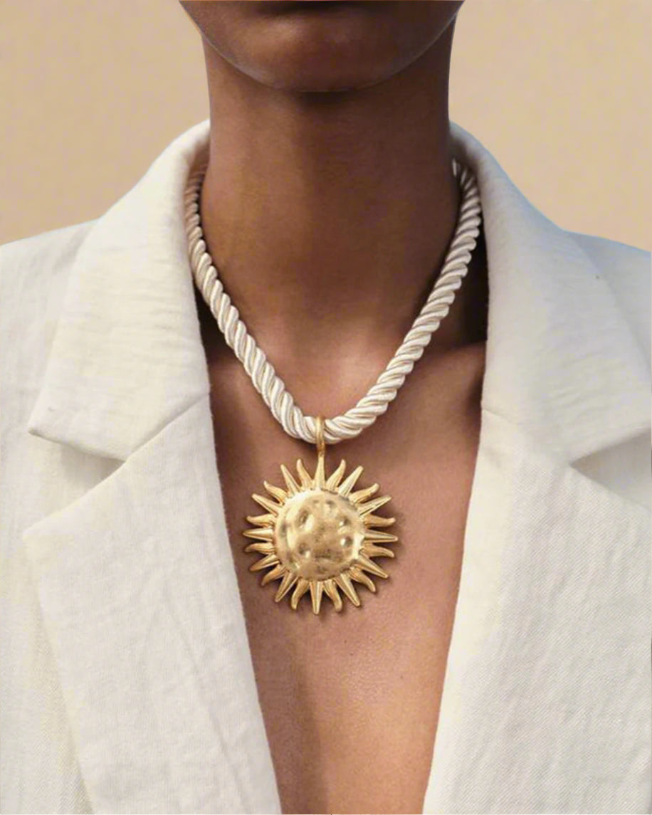 Et unikt statement-smykke med et markant solvedhæng i enten guld- eller sølvfinish og kraftigt, rustikt reb – perfekt til at løfte ethvert outfit.