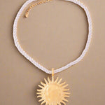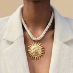 Solkraft Halskæden er designet til dig, der vil skille dig ud med stil. Med et iøjnefaldende, håndlavet solvedhæng i guld- eller sølvlook og en tyk rebkæde, skaber den et råt men sofistikeret udtryk. Ideel til både strandture, sommerfester og hverdagsbrug, hvor du vil tilføje et strejf af boheme-luksus.