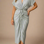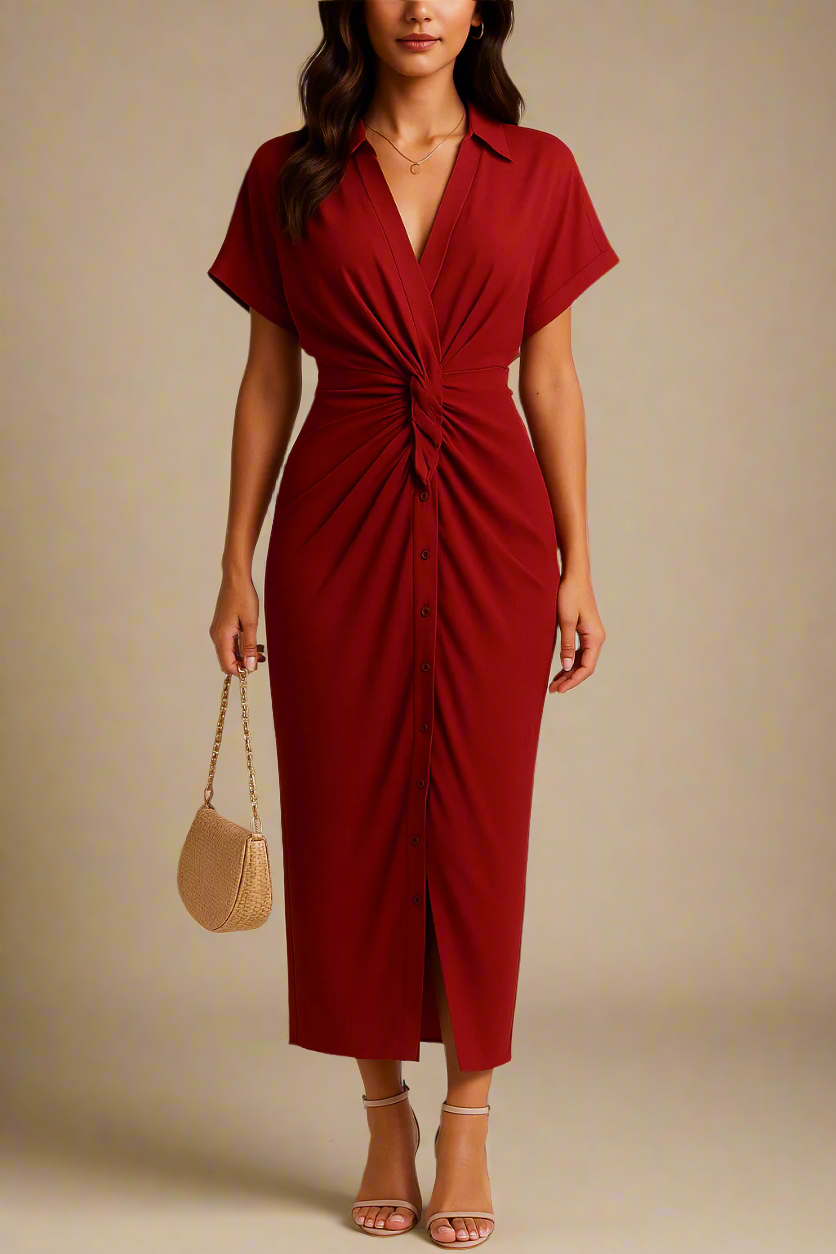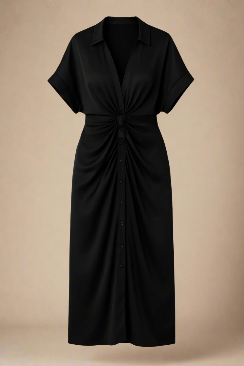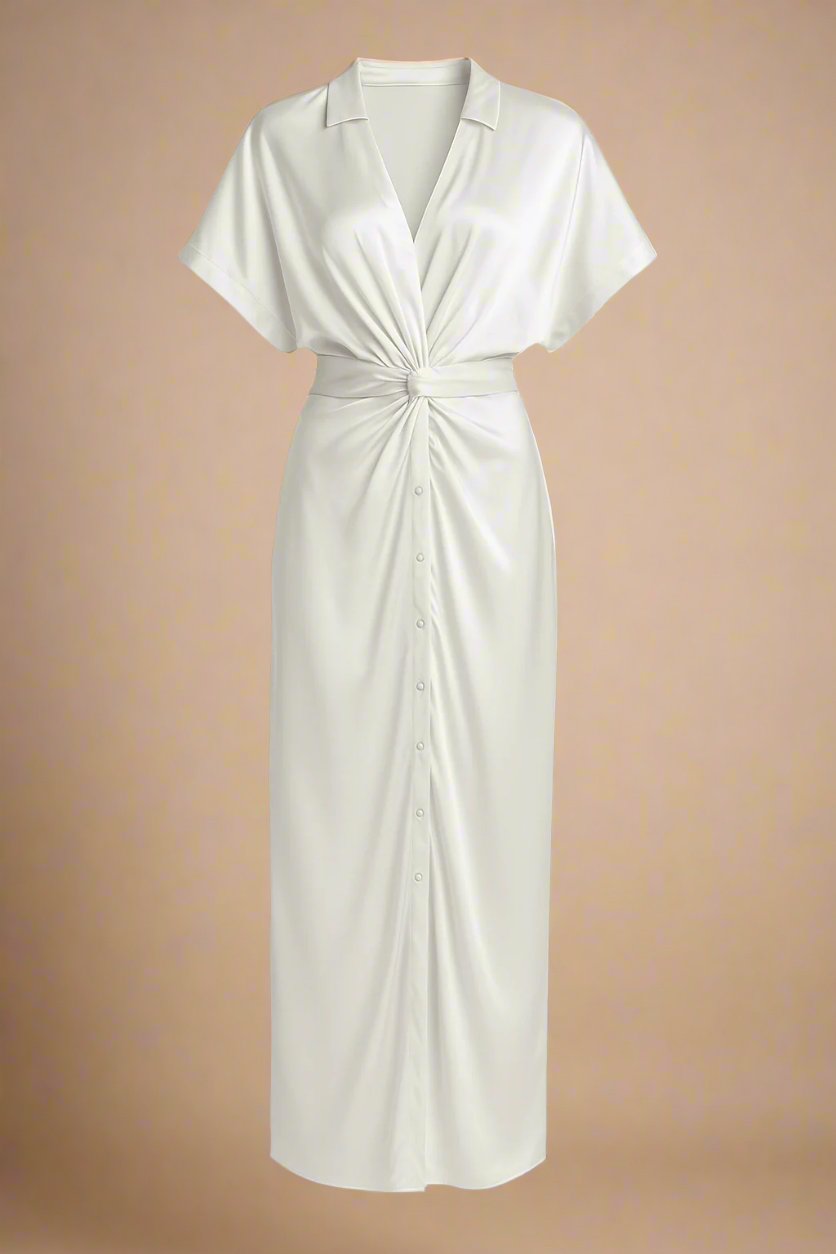 Let skinnende stof med afslappede ærmer og klassisk krave. Den dybe V-udskæring uden knapper giver et elegant fald, mens knuden i taljen fremhæver silhuetten med subtil dramatik. Perfekt til både hverdagsbrug og særlige lejligheder – style med sandaler, hæle eller en flettet taske for et komplet look.
