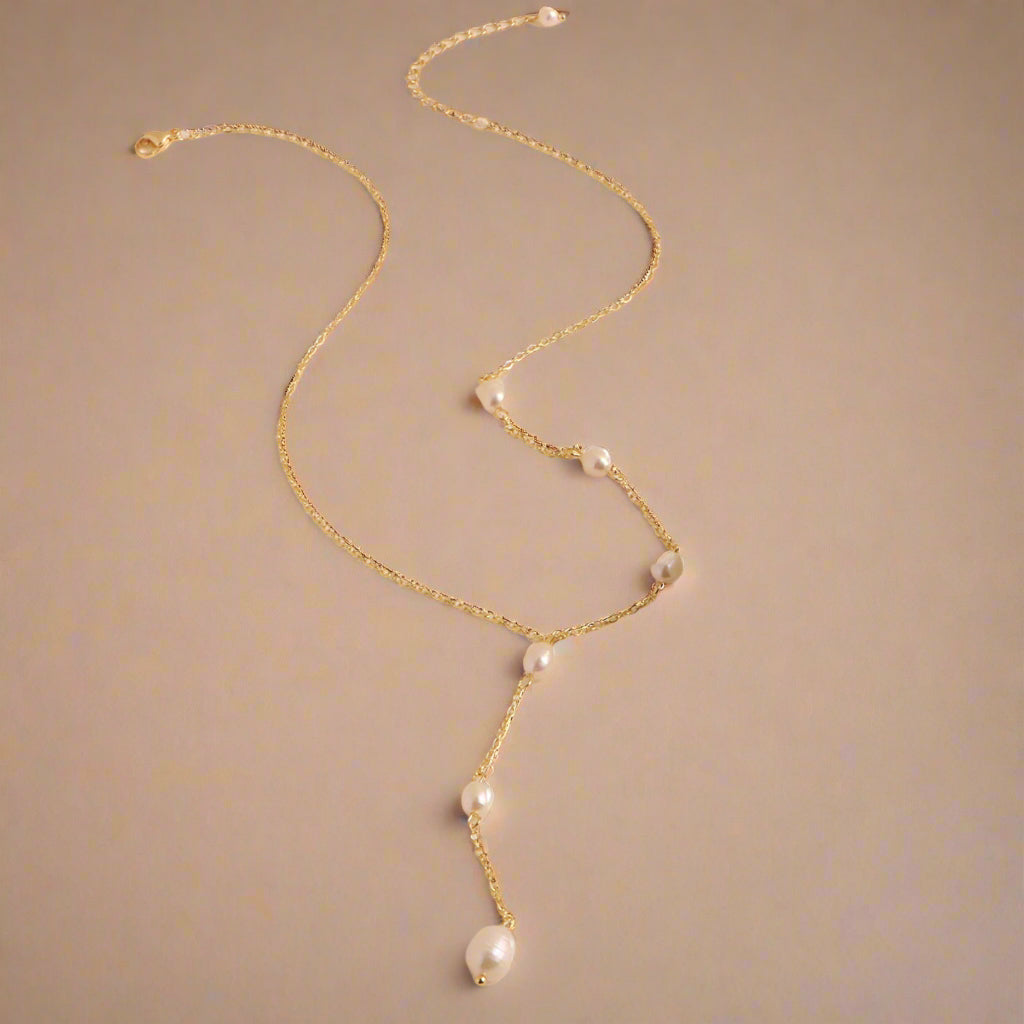 Den fine kæde med strategisk placerede perler smyger sig elegant om halsen og fremhæver din udskæring på en underspillet, men uimodståelig måde.